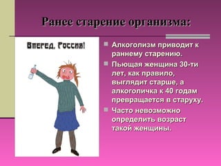 - Алкоголь может наносить ущерб клеткам и тканям, вызывая преждевременное старение.